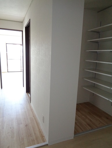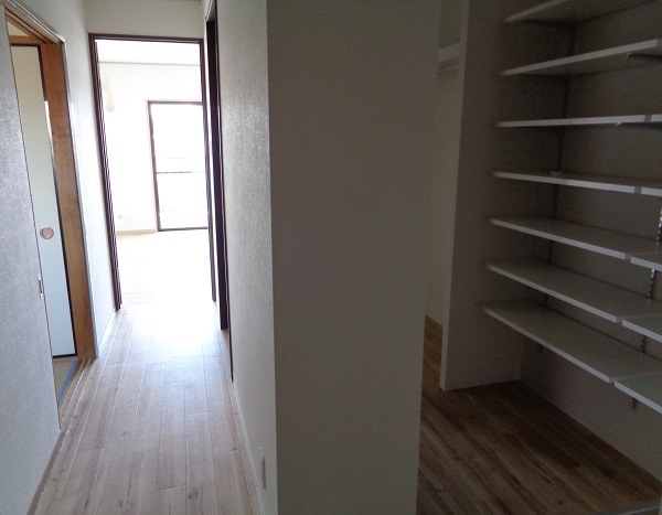 玄関収納は両側から通り抜けられるように壁を取り、ドアも新調します。