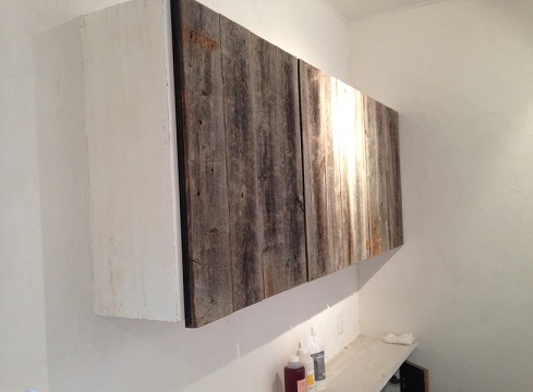 洗髪スペースには、古材を使用してオシャレに仕上げた収納を製作。