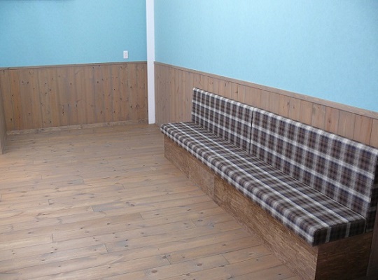 ソファーやレジカウンターも、お店の雰囲気に合わせて弊社でデ ザイン、製作させていただきました。