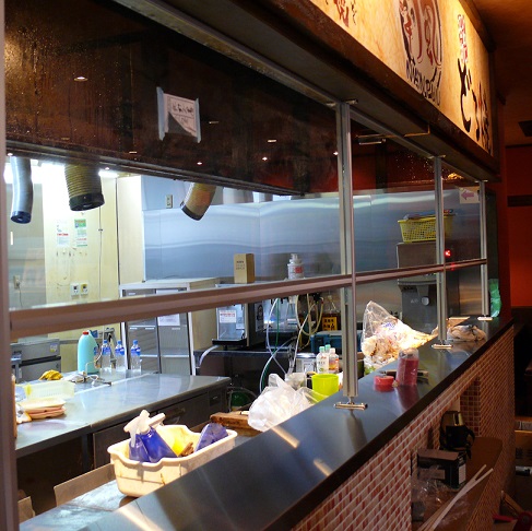 まずは厨房から取り掛かります。オープンキッチンのガラス張り部分を新調します。