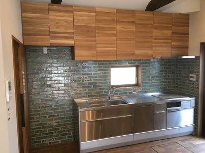 キッチンの壁は、施主の奥さまこだわりのタイル張りで仕上げていきます。