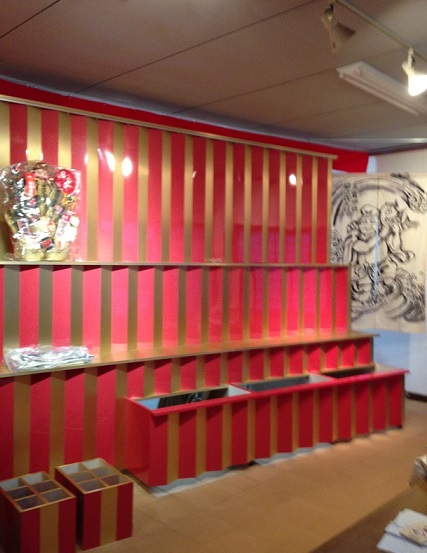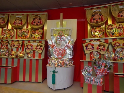 ひな壇にはえびすさんのお面をはじめ、数々の縁起物が並べられました。